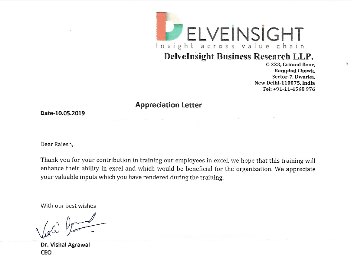 My Recognitions: DelveInsight Business Research LLP: The CEO Mr. Vishal Agrawal commended my successful 10-day training program for company employees.